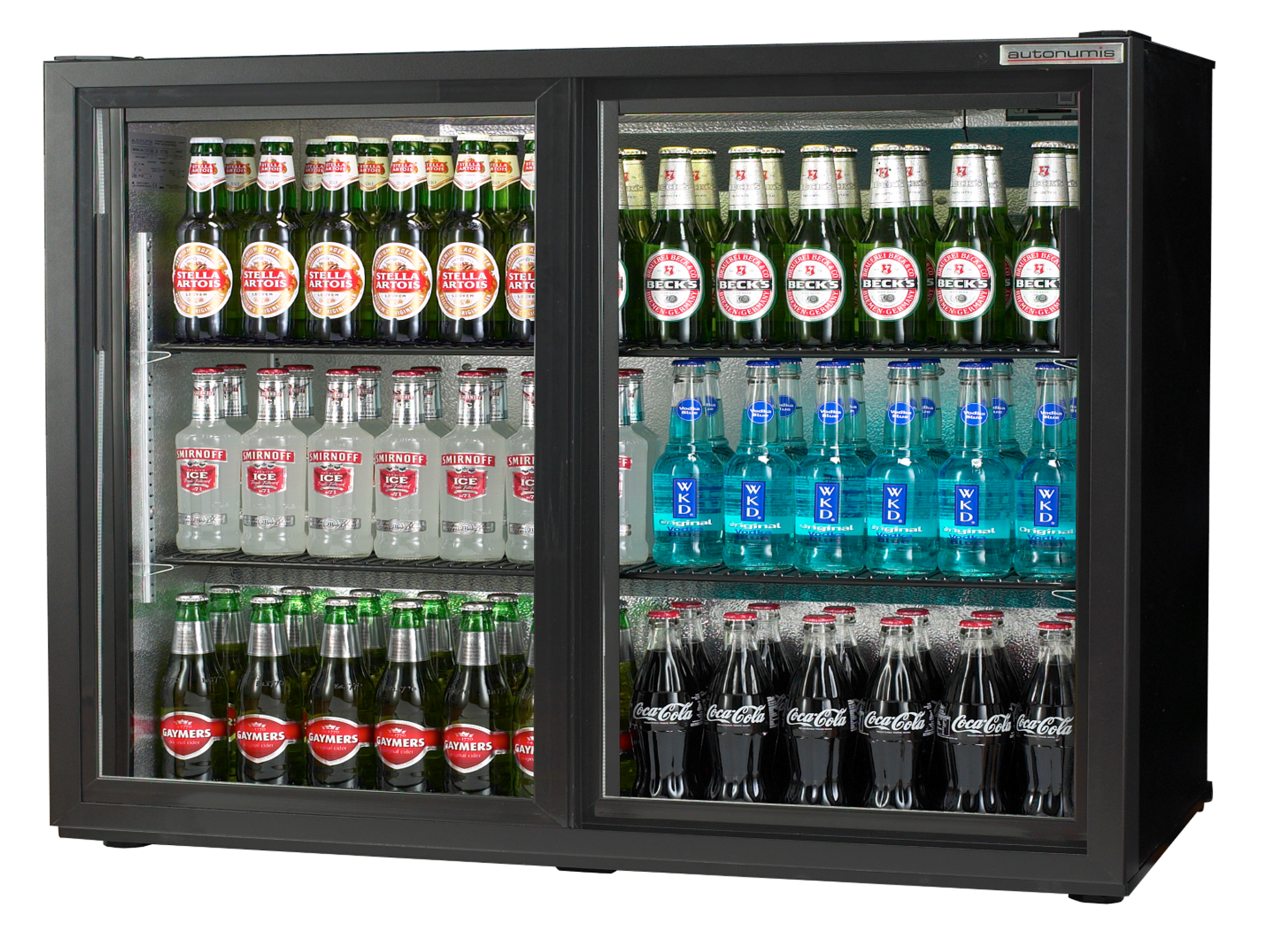 The Autonumis RQC10001 undercounter Maxi bottle cabinet is an extra wide double sliding door drinks cooler, finished in black and has been specially developed for back bar environments, ideal for use in pubs, clubs and restaurants. Fully illuminated internal LED lighting enhances the visual display of your best-selling bottled & canned products. This robust beer fridge with heavy duty compressor and fan assisted cooling gives rapid temperature pull down times which is crucial in busy establishments where bar staff need constant access to chilled products and are regularly opening the fridge doors allowing warm air in. This high-quality cabinet holds 240 x 330ml beer bottles or 320 x 330ml cans making it a great option behind any professional bar. With two adjustable full width shelves, double glazed sliding doors, adjustable feet for levelling makes this is an excellent choice for any licenced venue.