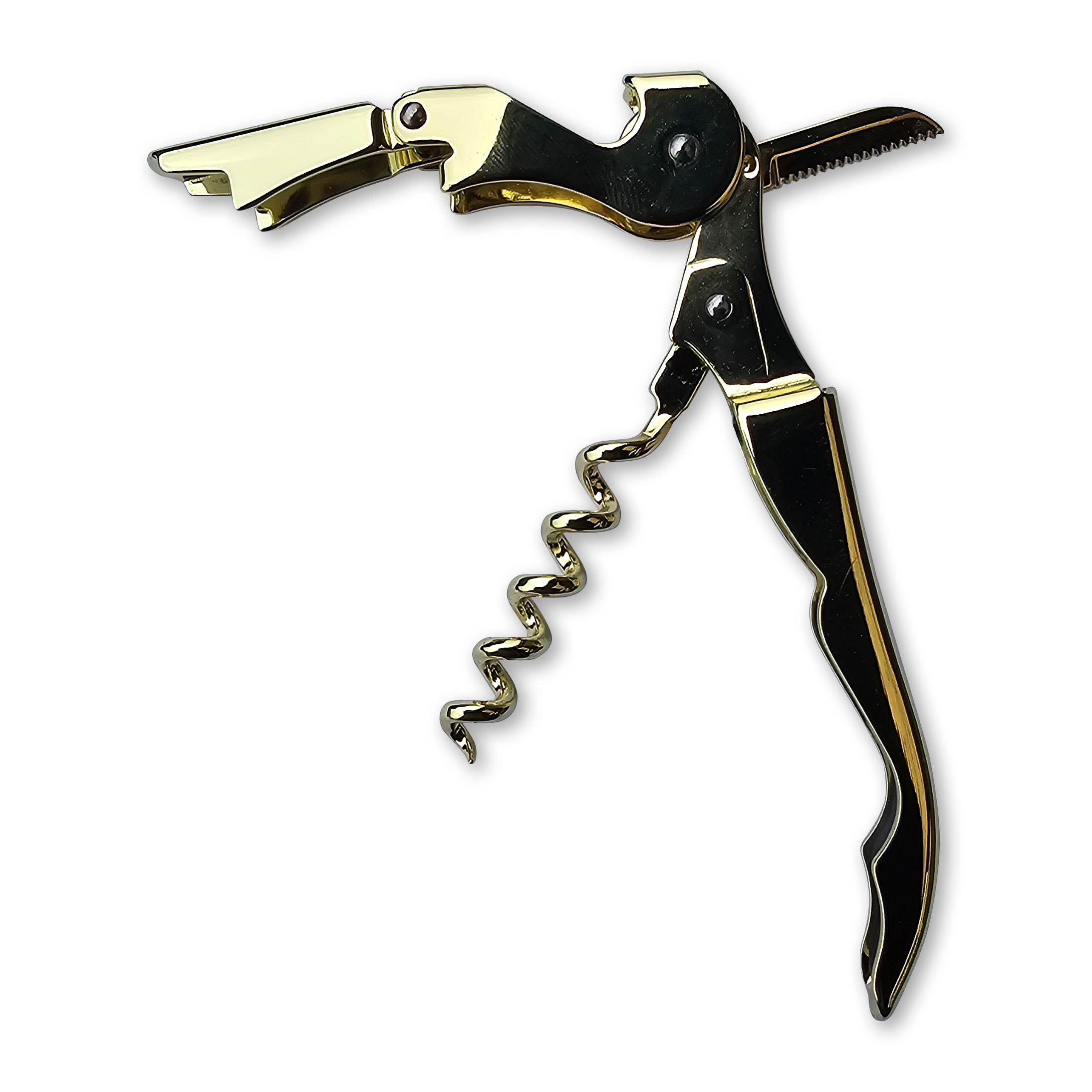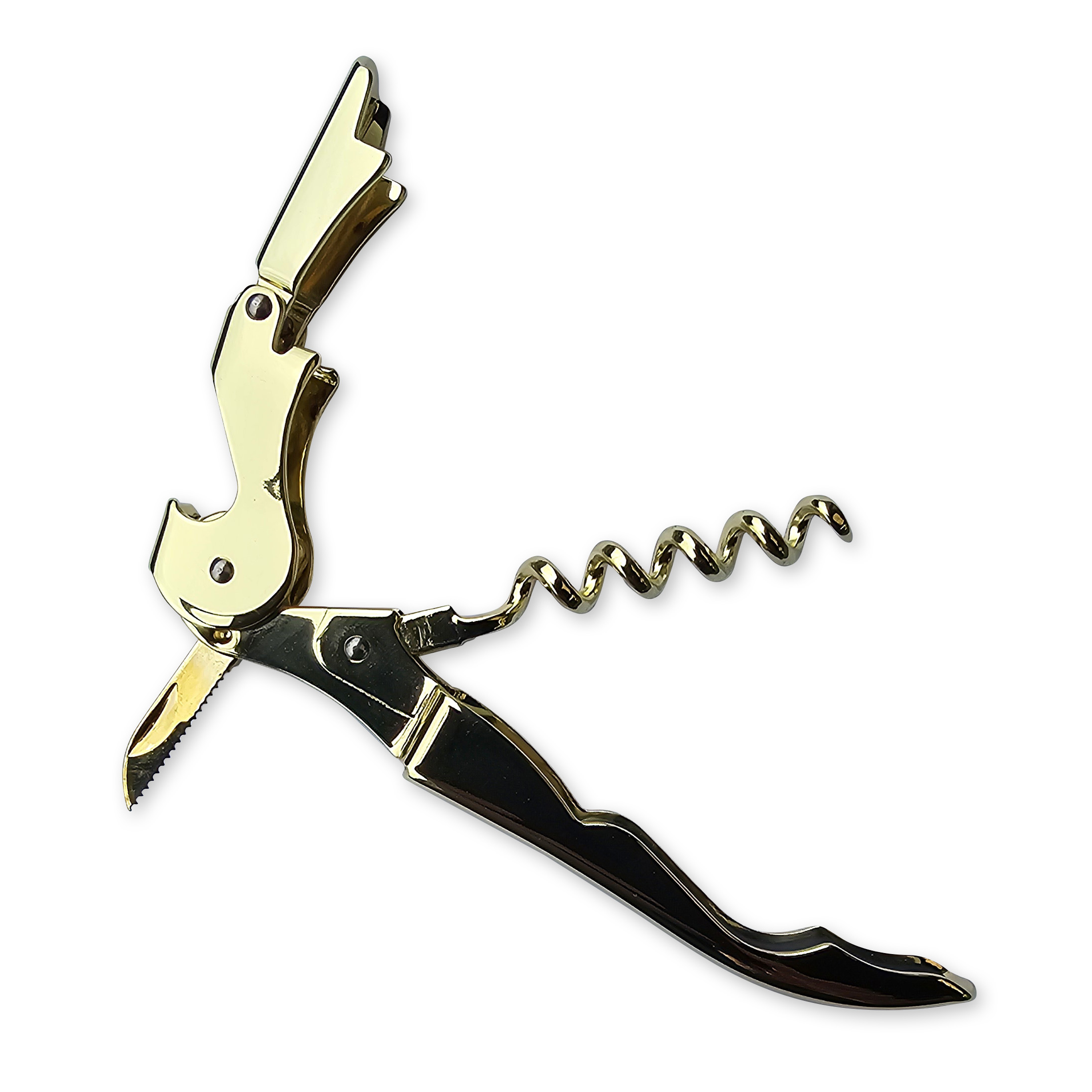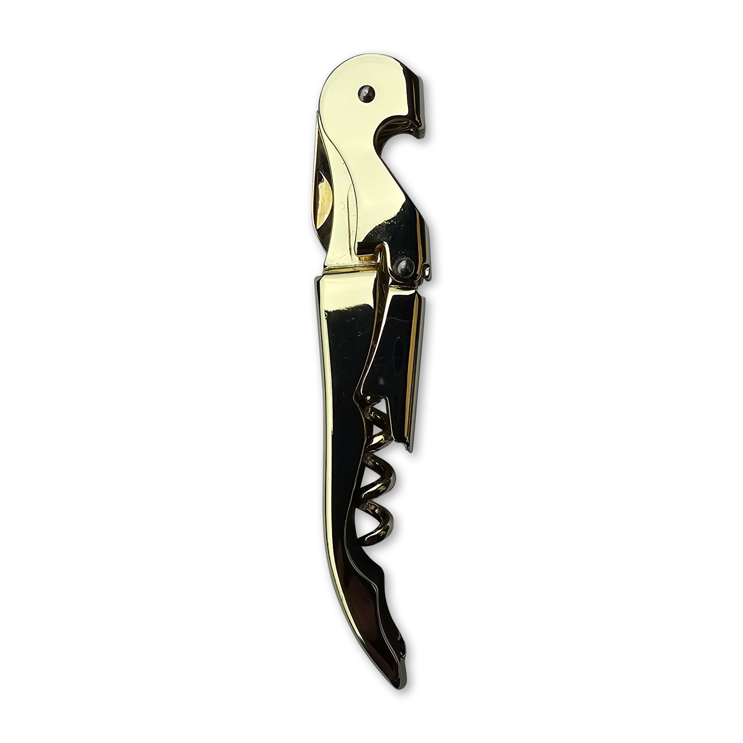 The Gold Plated Double-Reach Corkscrew is an essential tool for any professional or home bar. The gold plated finish gives a distinct look of flare and class. Not only is it a corkscrew but it also features a small blade for removing foil bottle wrappers. In addition to this it can be folded up and can fit easily into a waiters pocket.