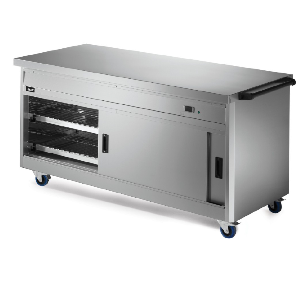 Helping to cater in demanding environments such as cafeterias, canteens and restaurants, the Panther 800 Series Hot Cupboard is perfect for plating and garnishing and as a pass to front of house staff, while it also provides extra workspace or can be used as a mobile workstation. The unit is fan assisted, providing even heat distribution, fast heat up and recovery times, and lower energy usage. Built for efficiency, the model has sliding doors to both sides, providing enhanced workflow capability. Fully 1/1 GN compatible, this unit accomodates 5 x 1/1 GN containers up to 150mm deep, while the thermostatically controlled bain marie top can be operated with wet or dry heat. An accurate digital electronic control of the hot cupboard temperature, adjustable between 20 and 99 °C, ensures compliance with food hygiene regulations.